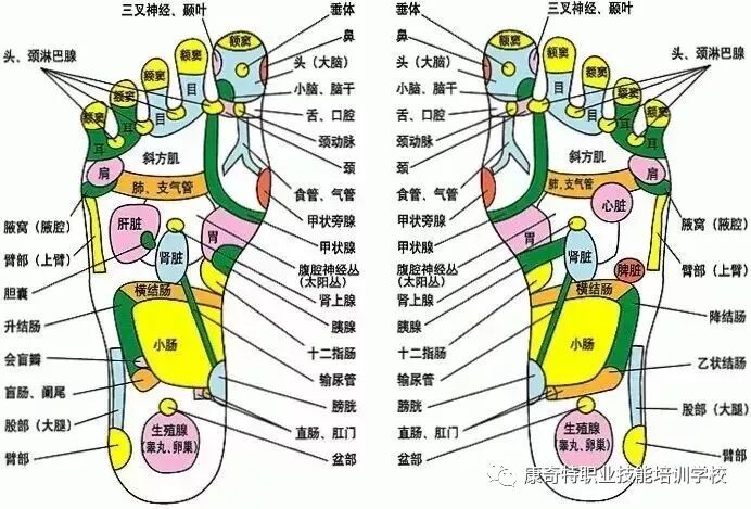 脚底与身的总的对应关系为——头部对应脚趾,胸部对应脚掌的前半部,腹部对应脚掌的中部,盆腔部对应脚跟。